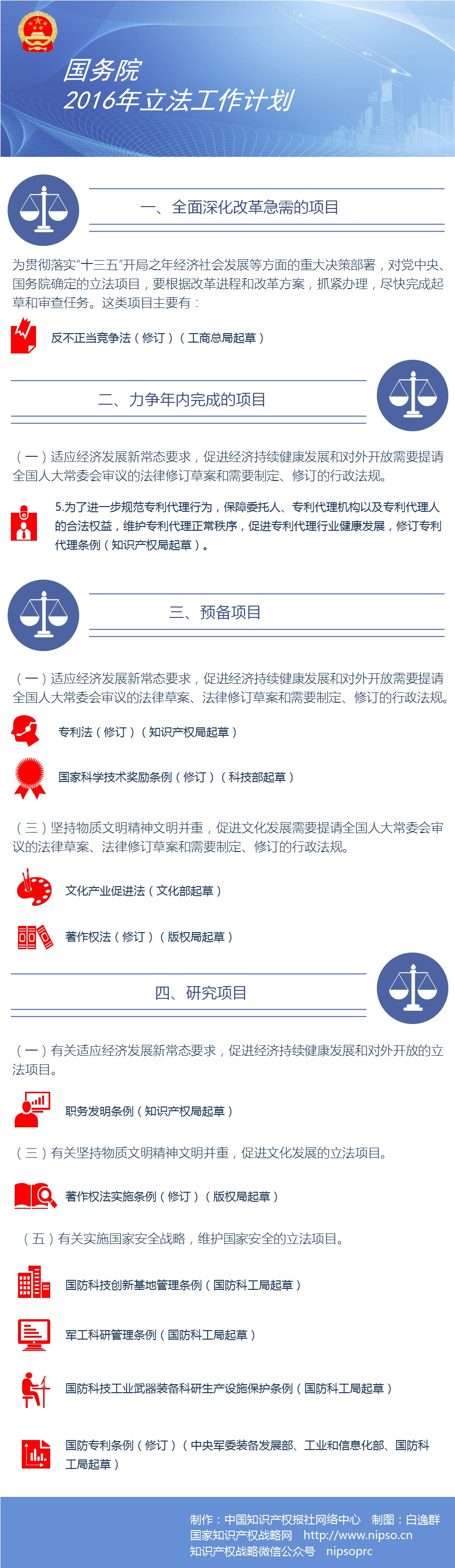 《国务院办公厅关于印发国务院2016年立法工作计划的通知》(下称《通知》)近日印发。《通知》提出做好国务院2016年立法工作的意见:着力推动创新、协调、绿色、开放、共享发展,服务于全面深化改革和持续推进简政放权,进一步提高政府立法质量,加强组织领导。《通知》指出,要着力推动创新发展,加快形成有利于创新发展的市场环境、产权制度、投融资制度、分配制度、人才培养引进使用制度等,健全知识产权创造、运用、管理、保护方面的制度。国家知识产权战略网对《国务院2016年立法工作计划》进行了摘编。