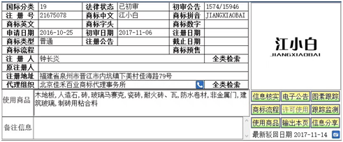 近日,畅科代理人在案件操作中发现,“江小白”商标在19类被抢注!虽说家具建材和白酒看起来毫无关联,但消费者可不一定这么想!