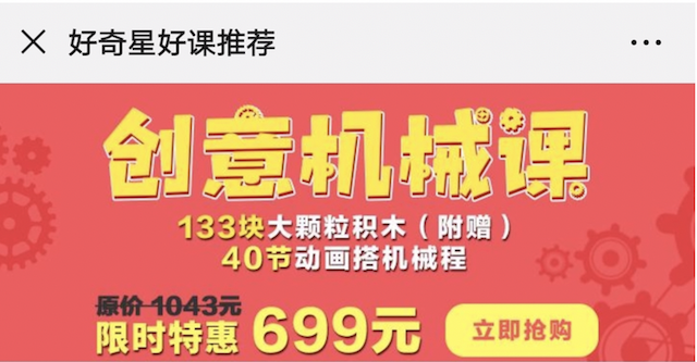 经作者对比,好奇星少儿创客公众号上显示,好奇星创意机械课的售价是699元,而盗版售价只要9.8元。