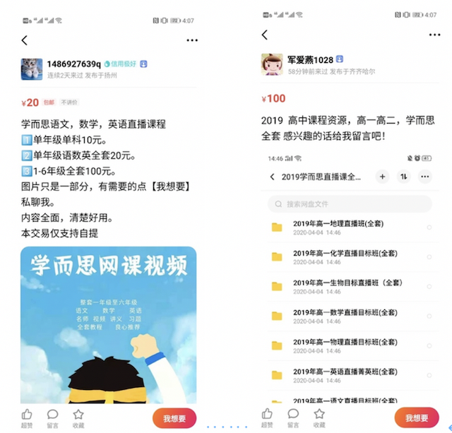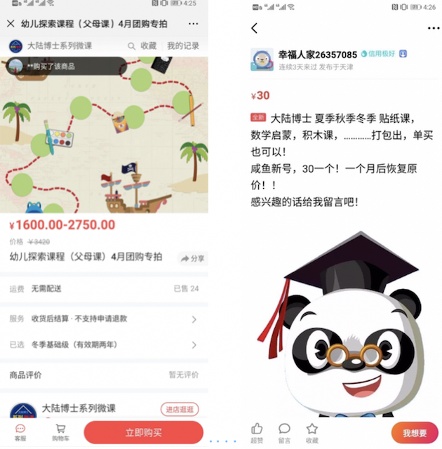 今日,笔者经闲鱼二手交易平台中搜索“学而思”、“好奇星创意机械课”、“大陆博士”等关键词时,发现了大量低价的盗版在线教育资源。