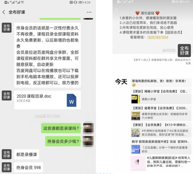 而进一步和“全布好课”聊天,很多新的课程资源是他购买后进行翻录,超级会员费用为598元,不打折。像“全部好课”的这样微信经营者很多,他们依靠长期积攒的盗版在线教育资源,通过“众筹”、“会员”等模式进行非法获利,并通过百度网盘群等进行非法传播,传播范围及受损失的在线交易企业的数量等危害都远超单个盗版资源传播带来的影响。